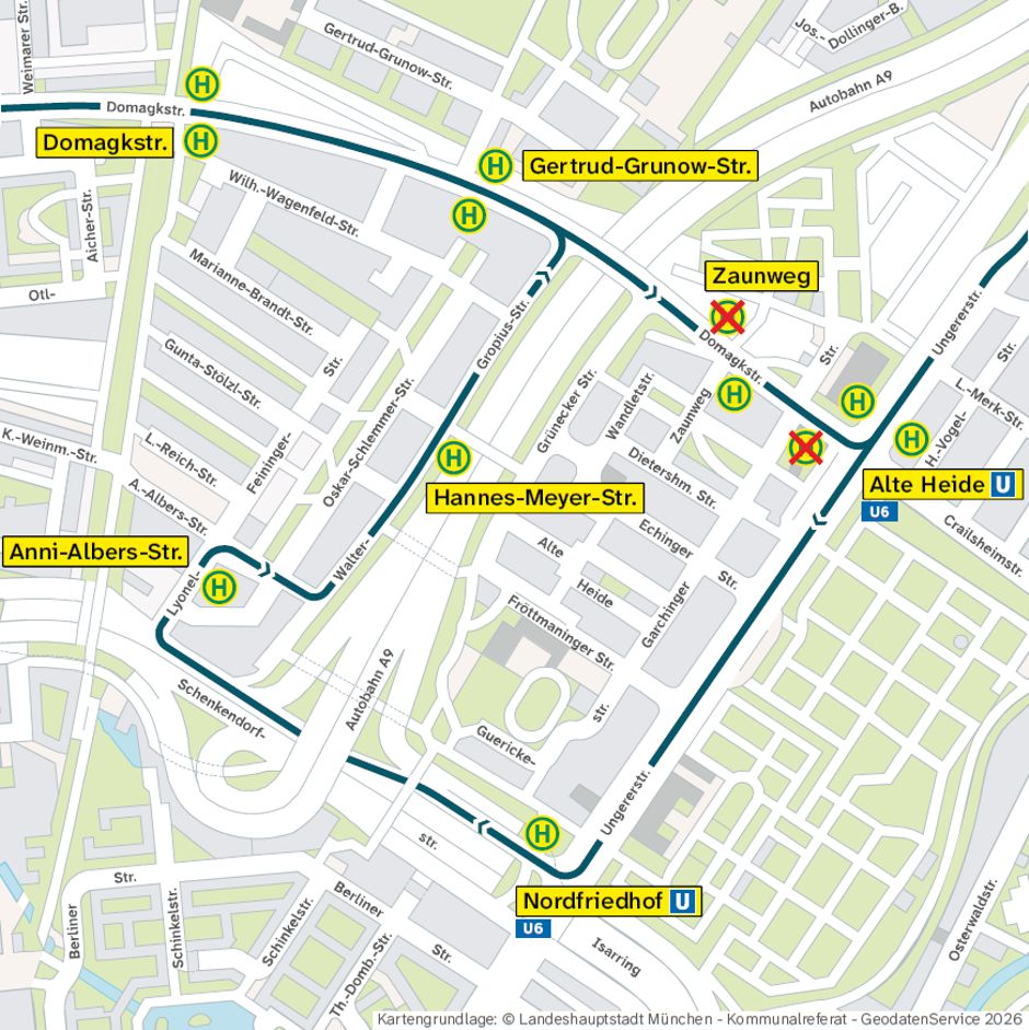 Die Haltestelle Zaunweg entfällt somit in Fahrtrichtung West (OEZ / Großhadern). Auf der Umleitungsstrecke werden die Haltestellen Nordfriedhof, Anni-Albers-Straße und Hannes-Meyer-Straße bedient.