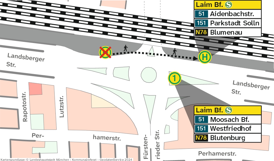 Aus betrieblichen Gründen wird die (H) Laim Bf. der Buslinien 51 > Aidenbachstraße, 151 > Parkstadt Solln und N78 > Blumenau ab Montag, 10. November 2025 bis vsl. Freitag, 28. August 2026 östlich der Einmündung Landsberger Straße / Wotanstraße (Höhe ASADO-Steakhouse) verlegt.