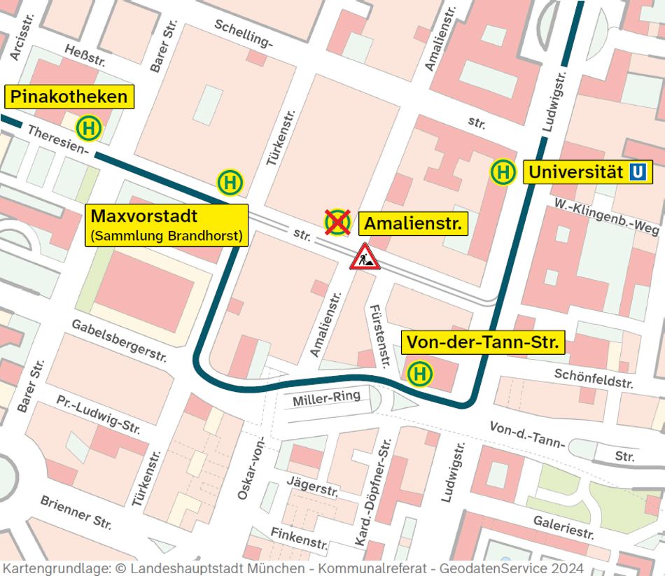 Wegen Straßenbauarbeiten in der Theresienstraße wird die Buslinie 68 von Montag, 30. März bis vsl. Mittwoch, 1. April 2026 zwischen Universität und Maxvorstadt / Sammlung Brandhorst umgeleitet.   Die (H) Amalienstraße entfällt. Auf der Umleitungsstrecke wird die (H) Von-der-Tann-Straße im Oskar-von-Miller-Ring bedient.