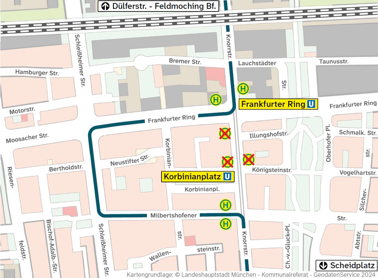Die (H) Frankfurter Ring ist in Richtung Münchner Freiheit - Karlsplatz (Stachus) an die Haltestelle der Buslinie 50 > Olympia-Einkaufszentrum vor dem BMW Motorrad Center verlegt, die (H) Korbinianplatz ist in beiden Fahrtrichtungen in die Milbertshofener Straße (westlich der Einmündung Knorrstraße) verlegt.