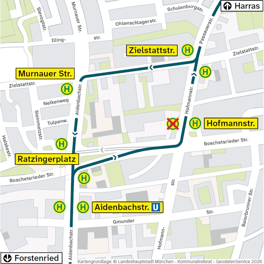 Wegen Straßenbauarbeiten in der Boschetsrieder Straße wird die Nachtlinie N41 > Fürstenried West von Donnerstag, 23. April bis vsl. Freitag, 26. Juni 2026 zwischen Zielstattstraße und Aidenbachstraße via Murnauer Straße umgeleitet. Die (H) Hofmannstraße entfällt.