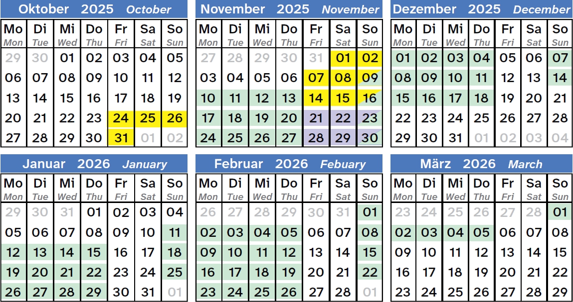 Wegen Bauarbeiten im Bereich Hauptbahnhof fahren von Sonntag, 9. November 2025 bis vsl. Donnerstag, 5. März 2026 jeweils von Sonntag bis Donnerstag (betroffene Tage siehe grün markierte Tage im Kalender) ab 22:30 bis Betriebsschluss die U1 und U2 auf ihrem gesamten Linienweg im 20-Minuten-Takt. Zwischen Hauptbahnhof und Kolumbusplatz ergibt sich aufgrund der Überschneidung beider Linien ein 10-Minuten-Takt.