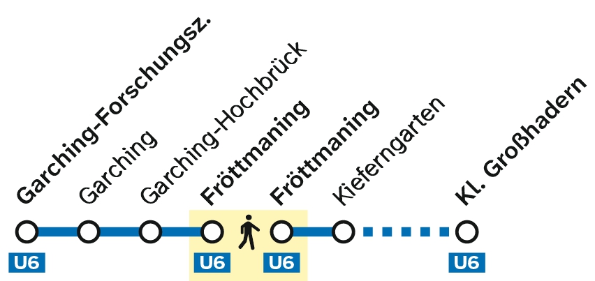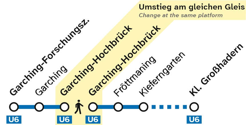 In Garching-Hochbrück erfolgt der Umstieg am gleichen Bahnsteig. Zwischen Fröttmaning und Garching-Hochbrück sowie innerhalb Garchings fährt die U6 regulär alle 20 Minuten.