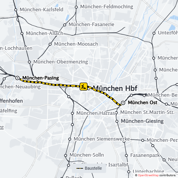 Auf Grund von Bauarbeiten zur 2. Stammstrecke kommt es in den Nächten von Montag/Dienstag, 27./28., bis Donnerstag/Freitag, 30. April/1. Mai 2026, jeweils von 21:20 Uhr bis 4:40 Uhr, zu Einschränkungen zwischen Pasing, Giesing, Ostbahnhof und Riem, wobei folgende Änderungen gelten: S1: Züge in und aus Richtung Freising bzw. Flughafen beginnen und enden am Hauptbahnhof auf den Gleisen 27 bis 35 und halten nicht an der Hackerbrücke. S2: Züge in und aus Richtung Erding beginnen und enden am Ostbahnhof und verkehren von und bis Riem ohne Halt. Züge in und aus Richtung Petershausen bzw. Altomünster beginnen und enden am Isartor. S3: Züge in und aus Richtung Holzkirchen beginnen und enden in Giesing. Züge in und aus Richtung Mammendorf beginnen und enden in Pasing. S4: Züge in und aus Richtung Trudering fallen zwischen Trudering und Pasing aus. Züge in und aus Richtung Geltendorf beginnen und enden am Heimeranplatz auf Gleis 11. S5: Züge in und aus Richtung Kreuzstraße beginnen und enden in Giesing. Züge in und aus Richtung Pasing fallen zwischen Giesing und Pasing aus. S6/S8: Züge in und aus Richtung Ebersberg beginnen und enden in Trudering; zwischen Trudering und Ostbahnhof besteht ein Ersatzverkehr mit Bussen. Züge in und aus Richtung Herrsching beginnen und enden in Pasing. Züge aus Richtung Tutzing fahren zum Flughafen, Züge aus Richtung Flughafen fahren nach Tutzing. S7: Züge in und aus Richtung Wolfratshausen verkehren planmäßig zwischen Hauptbahnhof und Wolfratshausen.