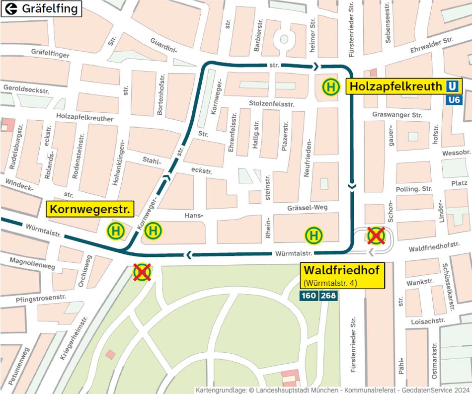 Die Linien 845 und 873 verkehren ganztägig über die Ganghoferstraße und bedienen die Haltestelle Ganghoferstraße ersatzweise.