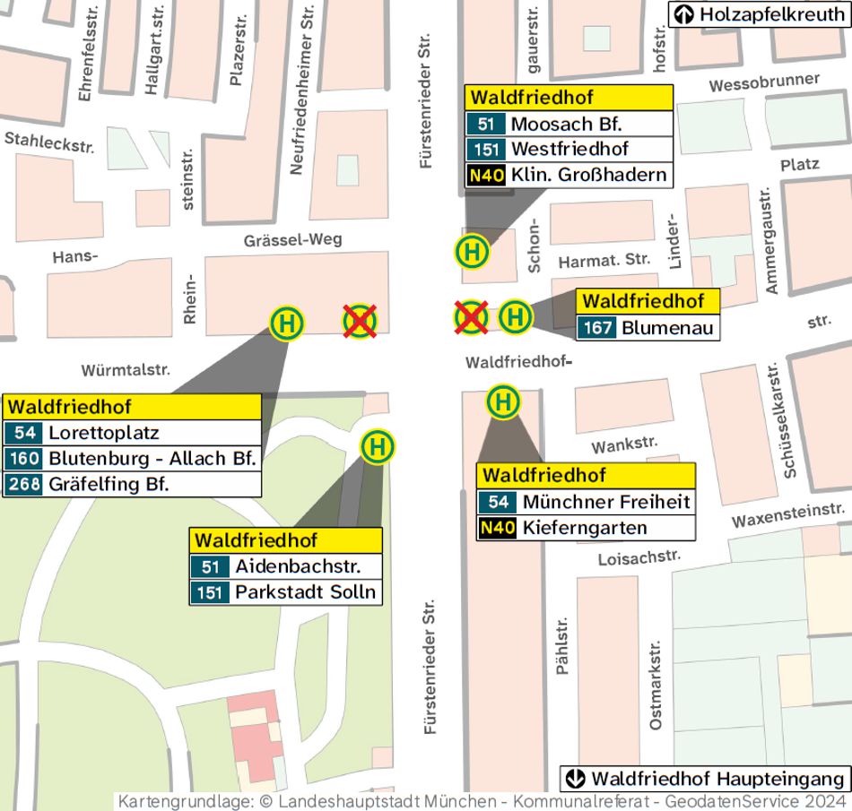 Ersatzweise werden die Haltestellen Fürstenfeld und Klosterstraße von den Linien 840, 845 und 873 bedient.
