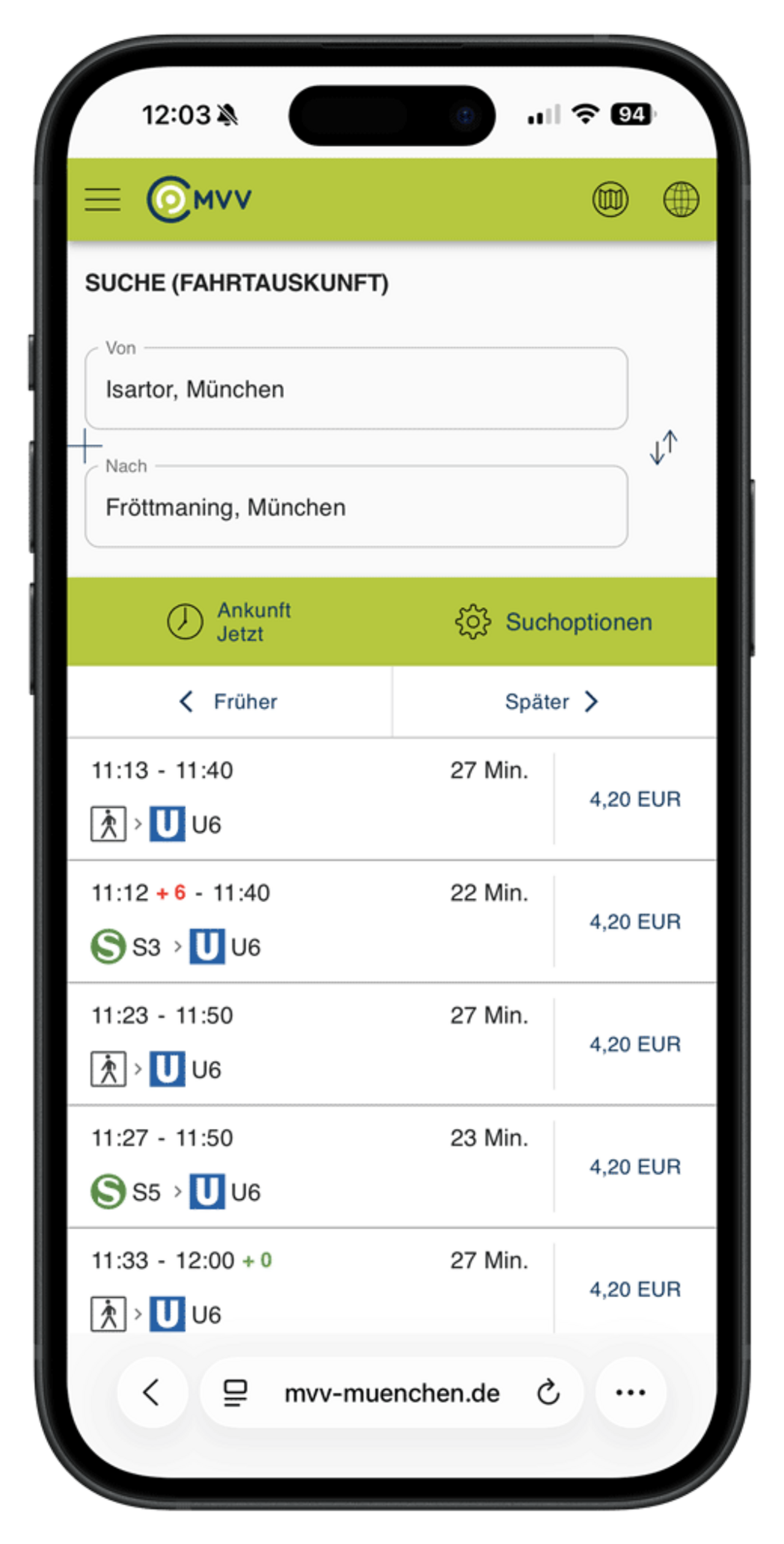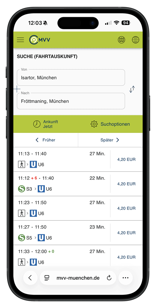 Funktioniert die automatische Weiterleitung nicht, kann die mobile Version direkt unter www.mvv-auskunft.mobi geöffnet werden.