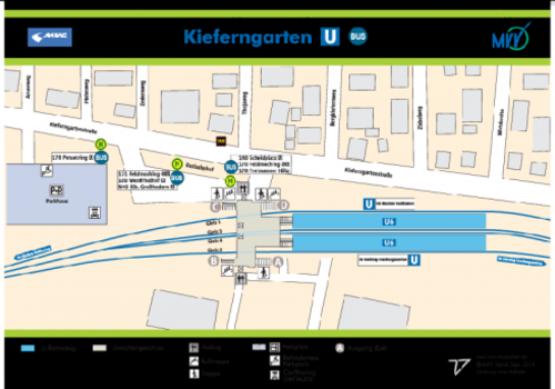Der viergleisige, oberirdische U- Bahnhof war bis 1994 nördlicher Endbahnhof der U6. Seit der Eröffnung der Streckenverlängerung nach Fröttmaning 1994 ist Kieferngarten ein Durchgangsbahnhof. (Quelle: muencherubahn.de)