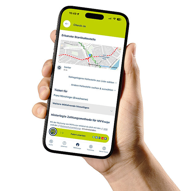 Einfach die MVV-App oder Partner-App öffnen, über den Bildschirm wischen („swipen“) und die Fahrt starten.